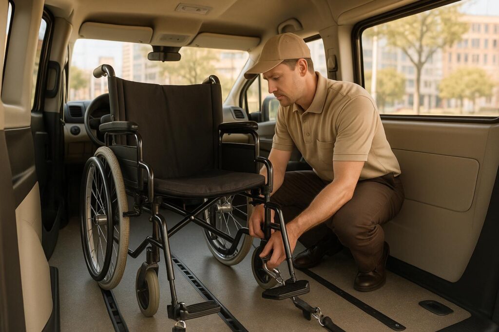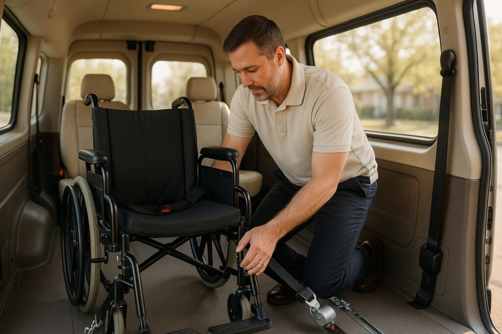 Guide to safe wheelchair securement for Austin NEMT: ADA and WC19 rules, four-point tie-downs, occupant restraints, equipment types, and driver training.